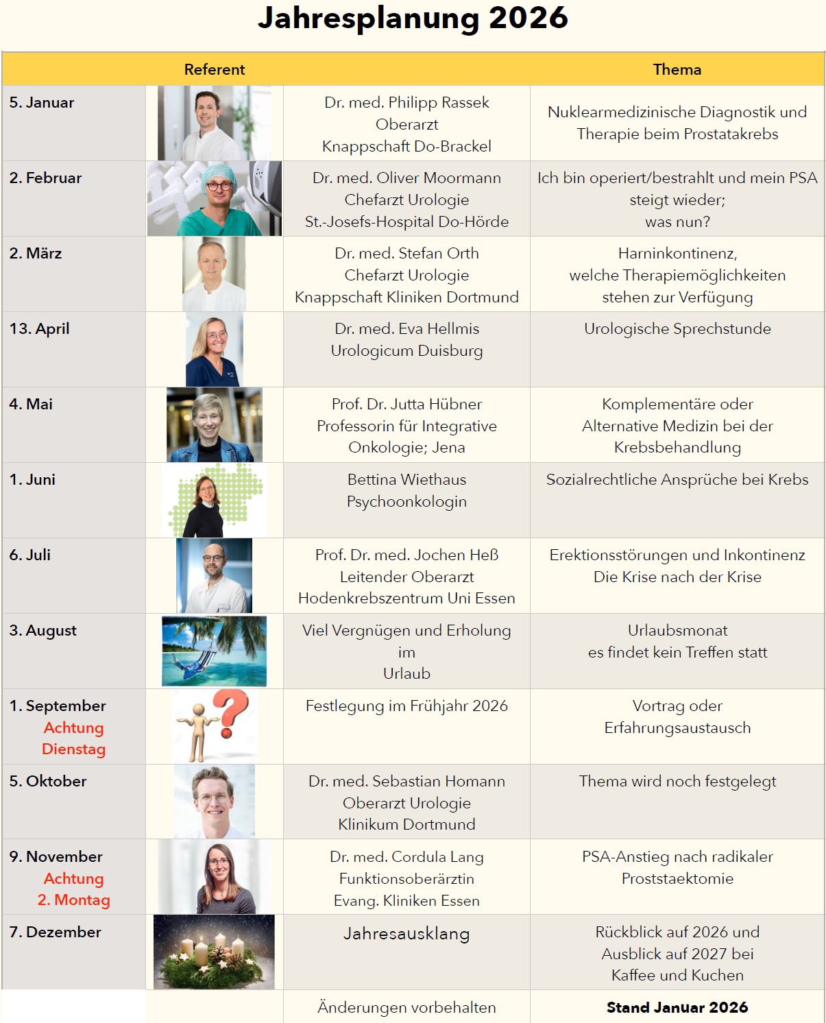 In dieser Übersicht sehen Sie die bisher abgestimmten Termine mit den Referenten für das laufende Jahr: